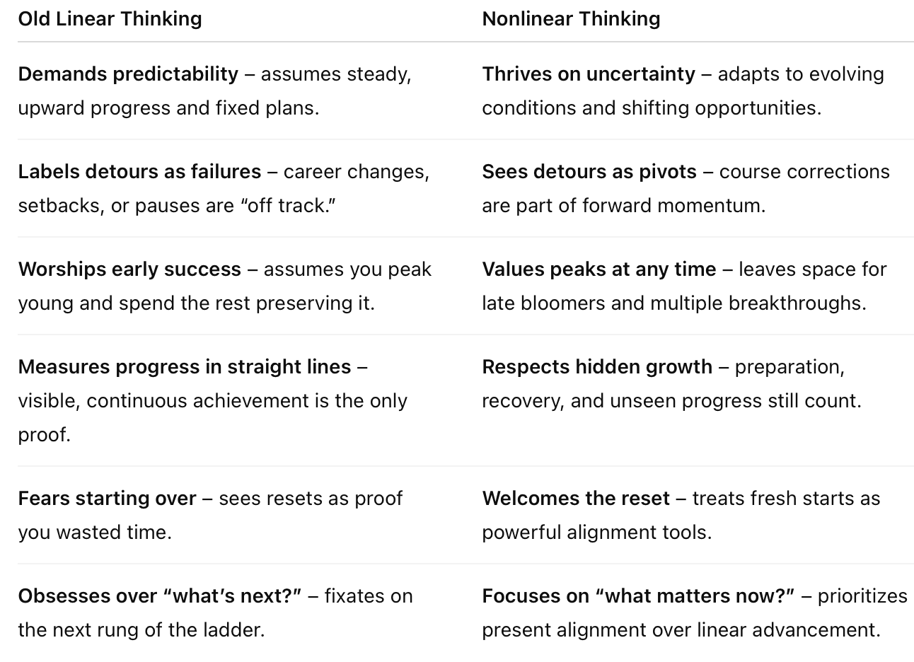 A nonlinear model honors the idea that your best work might not happen in your 30s. That your purpose may evolve across life chapters. That a second or third reinvention isn’t a deviation — it’s the design.